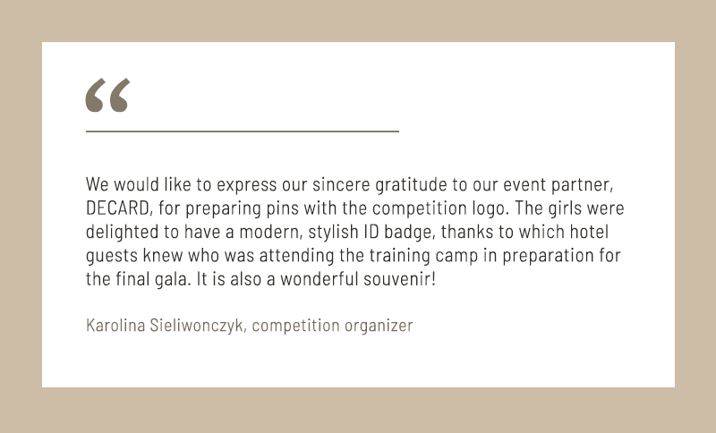 The pins received overwhelmingly positive feedback. Contestants wore them proudly throughout the competition, organizers appreciated their functionality, and guests saw them as a detail that elevated the event’s prestige. After the final gala, the pins became treasured custom keepsakes – a memory of the event that participants continue to value.