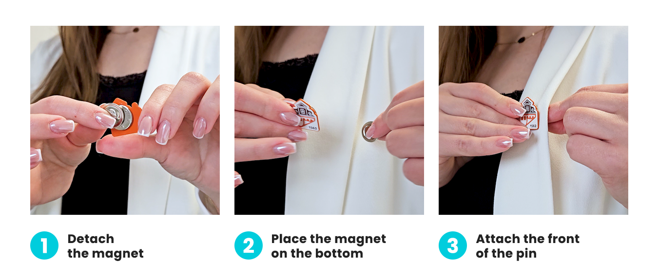 Attaching a magnetic badge pin is quick, easy, and completely safe for fabrics. Follow these three simple steps: