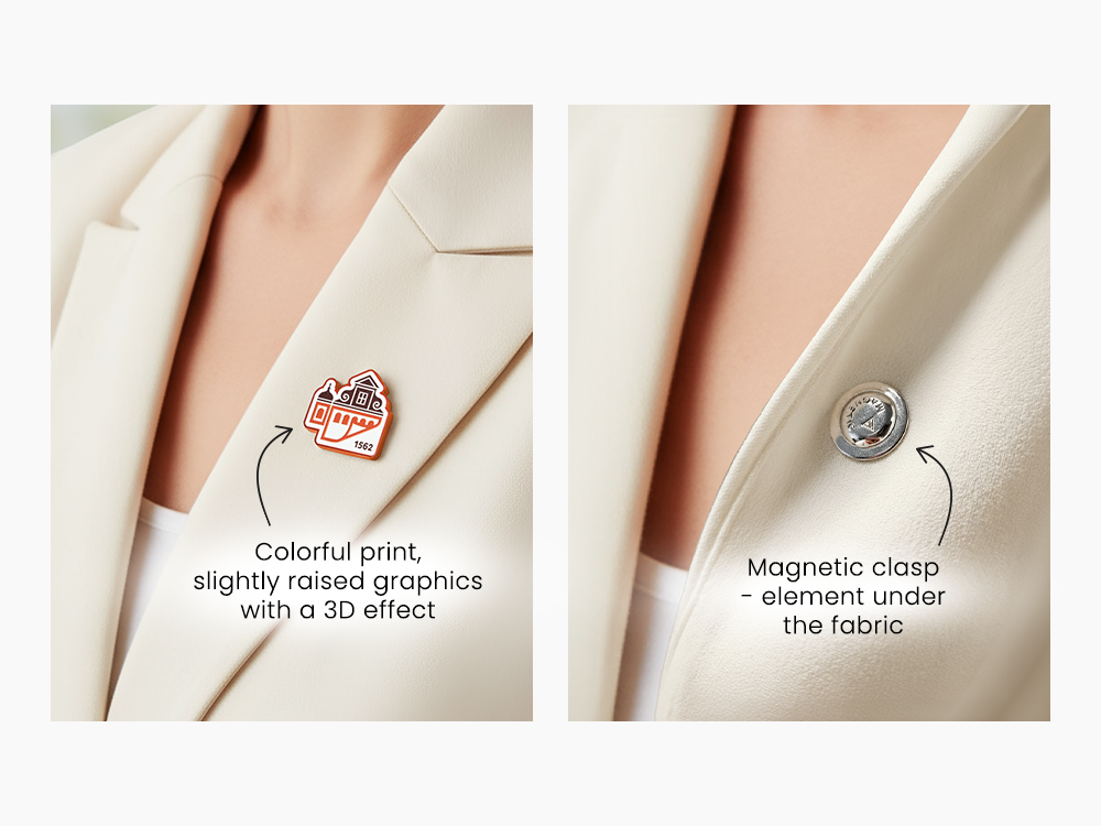 Magnetic badge pins offer a modern solution that combines convenience, safety, and elegance. They do not damage clothing, stay securely in place even on thick fabrics, and help maintain the perfect appearance of corporate apparel.