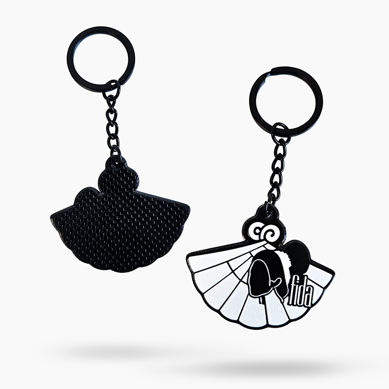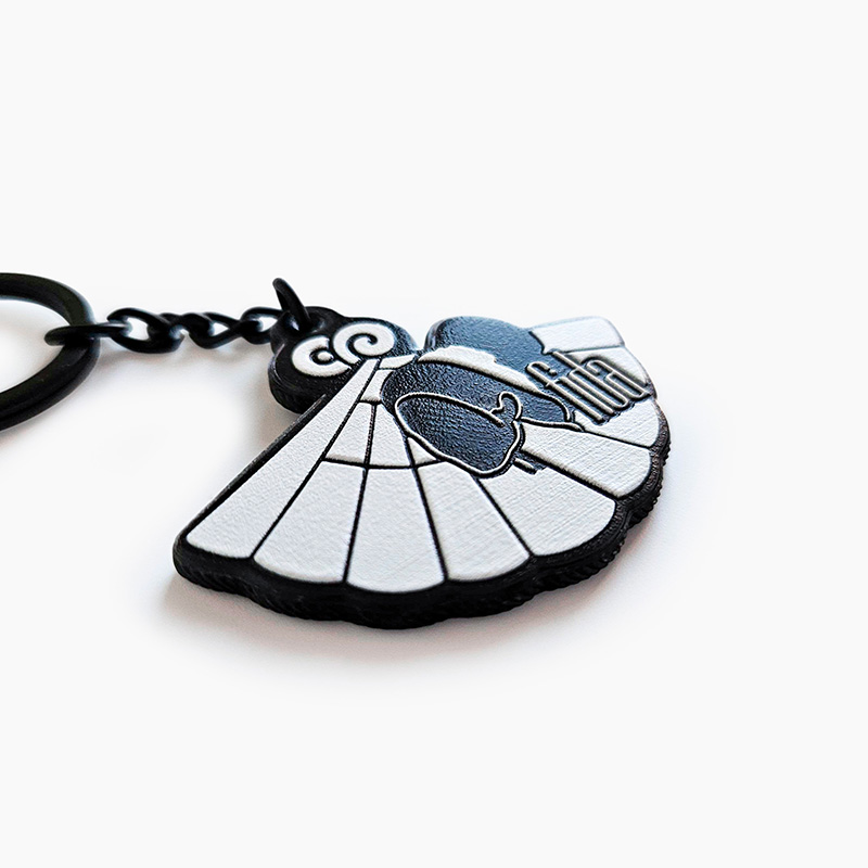 An elegant keychain made of durable, lightweight resin in classic black and white, finished with a glossy sheen and subtle embossed details that give it a distinctive character. The precise 3D elements highlight the craftsmanship and make the keychain stand out from standard promotional items. Perfect as a personalized gift, a component of visual brand identity, or an accessory for those who appreciate style and minimalism.