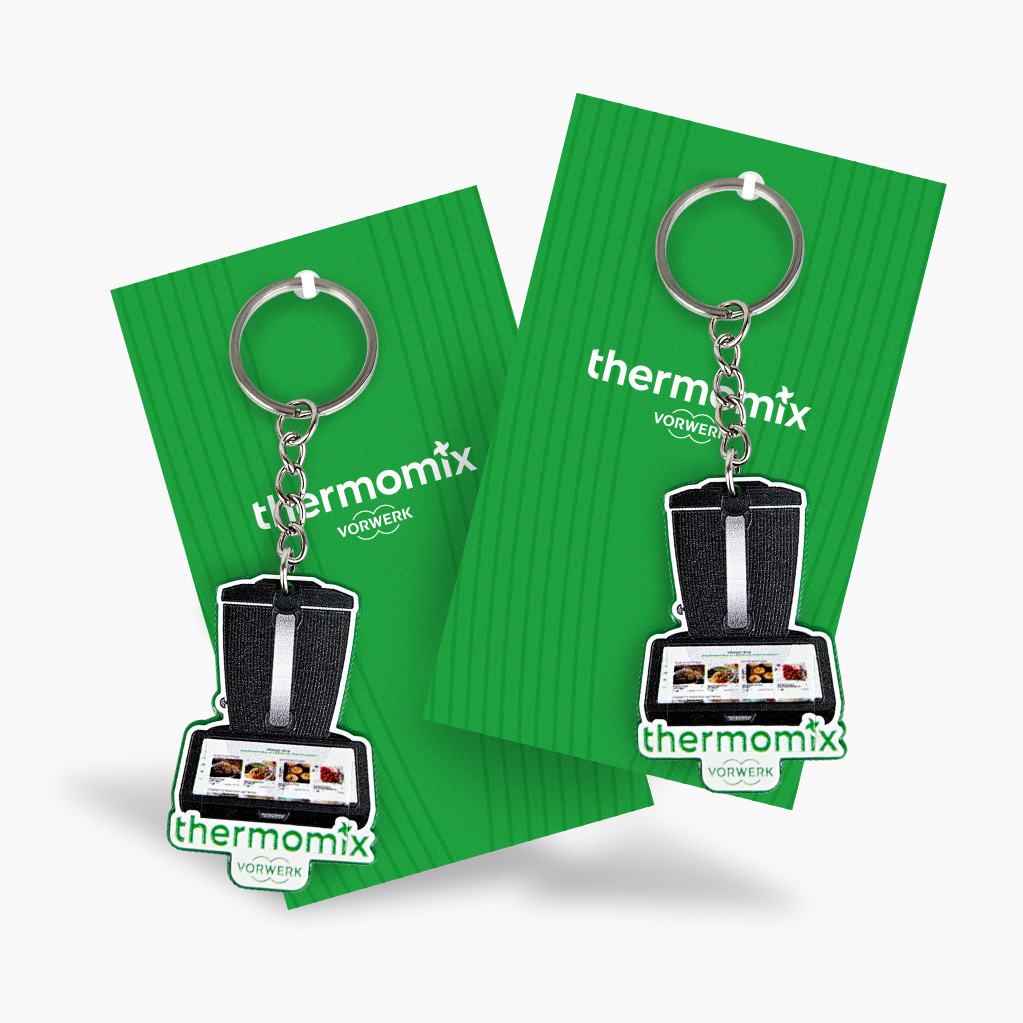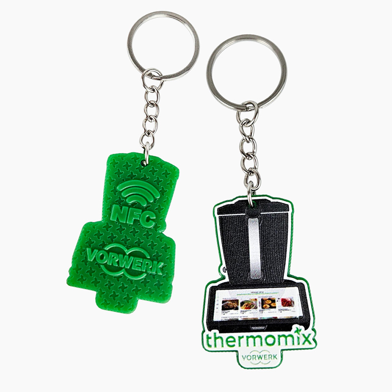 The NFC keychain in the shape of a Thermomix, made from hard, lightweight resin, impresses with its shine and raised 3D graphics in vivid colors. The back of the keychain features durable 3D markings with a logo and NFC symbol, allowing quick connection to a website or online business card. It is a modern, interactive premium promotional gadget that combines striking design with NFC technology.