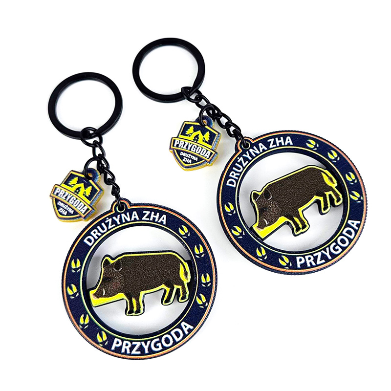Rotating keychain featuring a wild boar with a logo pendant, made of durable, solid, yet lightweight resin. Decorated with raised 3D graphic elements in vibrant, glossy colors, along with decorative patterns on the edges. The central element rotates a full 360°.