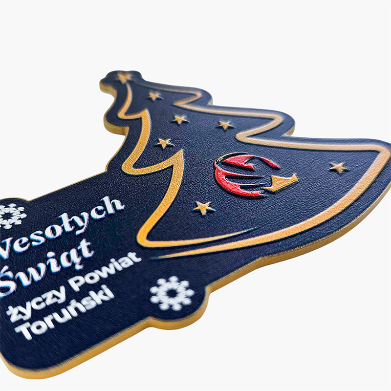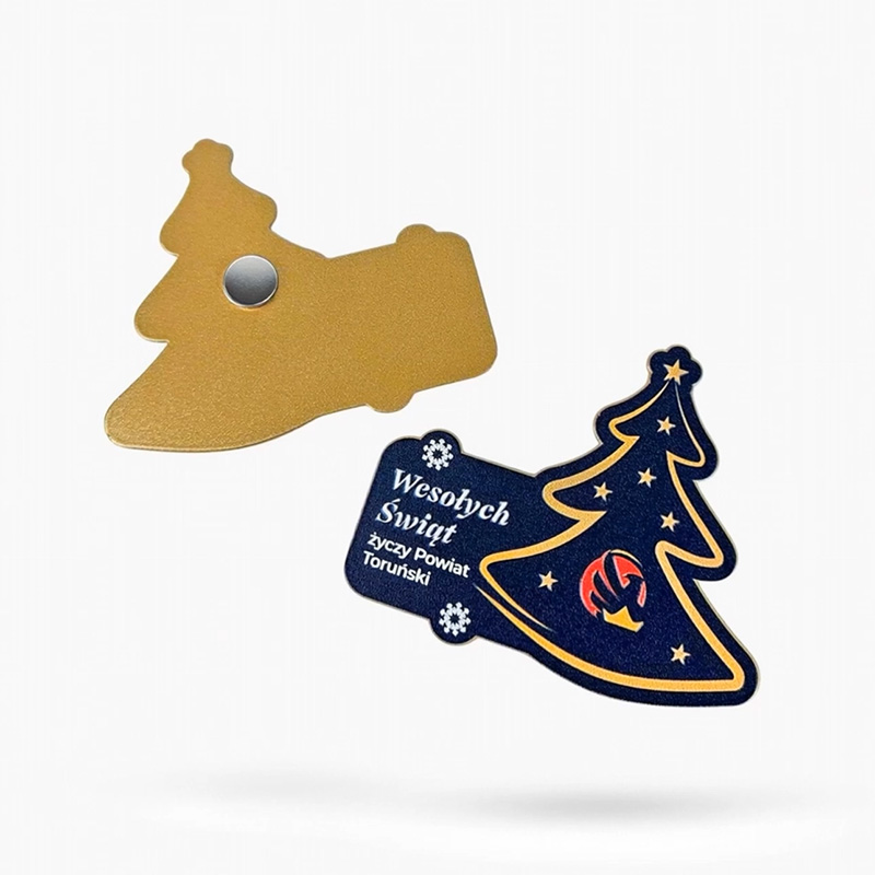 An elegant Christmas tree-shaped magnet with embossed 3D graphics, where every detail—from stars to the letters in the greeting—is tactile. A gold back and vibrant front colors create a harmonious, premium look. Made from solid metal with meticulous finishing, it is an ideal gadget for companies, offices, and institutions.