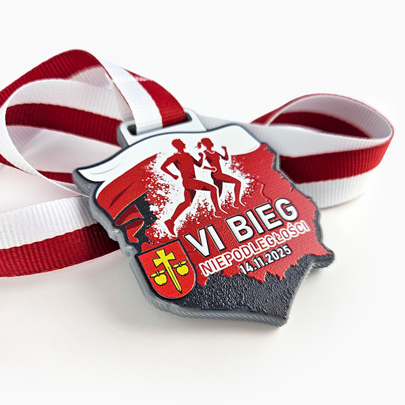 Patriotic 3D medals for the 6th Independence Run – made from hard and lightweight resin. The front features dynamic graphics of runners, while the back displays the municipality’s coat of arms in 3D technology and concave patterns highlighting the details. The design is completed with a white-and-red ribbon, creating a distinctive national accent. These medals are ideal for runs, sports competitions, and patriotic events, perfect for organizers seeking modern, durable, and aesthetically pleasing custom-made medals.