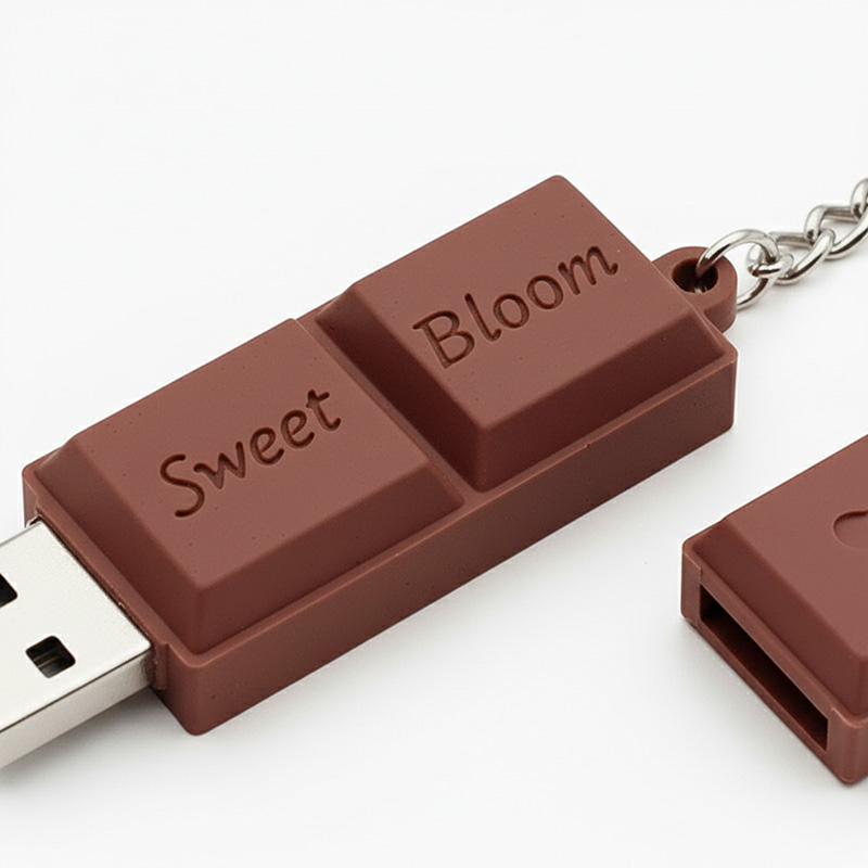 A fully 3D USB pendrive shaped like a milk chocolate bar, made from lightweight and durable resin. The surface of the bar features the recessed inscription “Sweet Bloom,” while the cap is adorned with a subtle recessed heart. Realistic chocolate details give the gadget an elegant and appetizing appearance. The pendrive comes with a metal keyring, perfect for keys or attaching to a bag, ensuring ease of use. This is a creative promotional gadget for bakeries, cafés, lifestyle brands, and companies that want to emphasize sweetness and unique design.