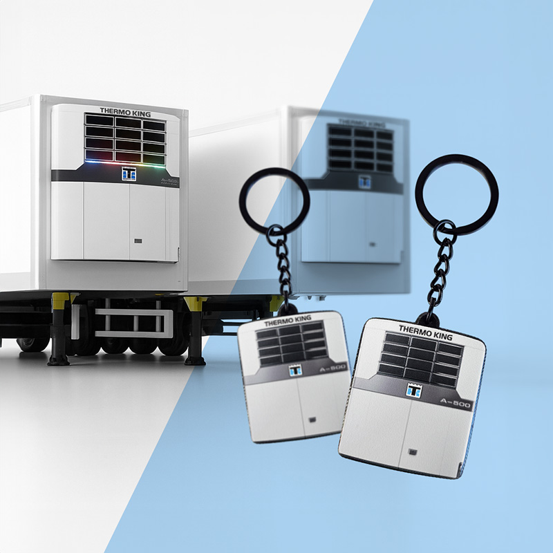Brelok miniatura agregatu chłodniczego, z kodem NFC, dla nowoczesnej firmy wykonany z twardej, solidnej i jednocześnie lekkiej żywicy. Ozdobiony wypukłymi elementami graficznymi 3D w wyrazistych kolorach.