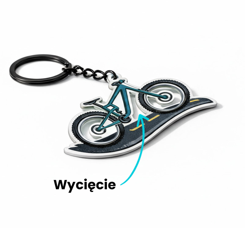 Brelok w kształcie roweru wykonany z twardej, solidnej żywicy, z oryginalnym wycięciem na wylot. Ozdobiony wypukłymi elementami graficznymi 3D w żywych kolorach. Każdy mikrodetal doskonale widoczny i precyzyjnie wykonany.