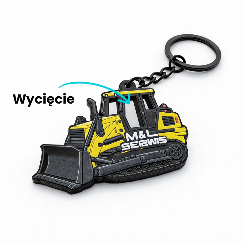 Brelok w kształcie spychacza gąsienicowego, wykonany z eleganckiego i solidnego metalu, z oryginalnym wycięciem na wylot. Ozdobiony wypukłymi elementami graficznymi 3D w żywych kolorach z połyskiem. Każdy mikrodetal doskonale widoczny i precyzyjnie wykonany.