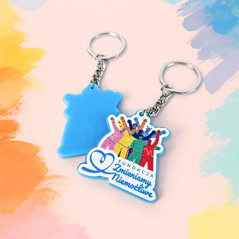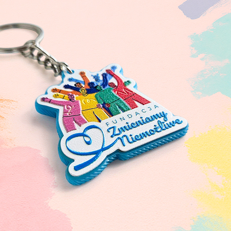 Personalizowany brelok reklamowy stworzony dla Fundacji Zmieniamy Niemożliwe to oryginalny gadżet promocyjny o nieregularnym kształcie, żywych kolorach i wypukłej grafice 3D. Boki zdobią dekoracyjne wzory 3D, a tył breloka ma wklęsłe zdobienia w dopasowanym kolorze. Wykonany z twardej, lekkiej i trwałej żywicy, idealnie sprawdzi się jako brelok z logo, upominek firmowy lub kreatywny dodatek do kampanii społecznej.